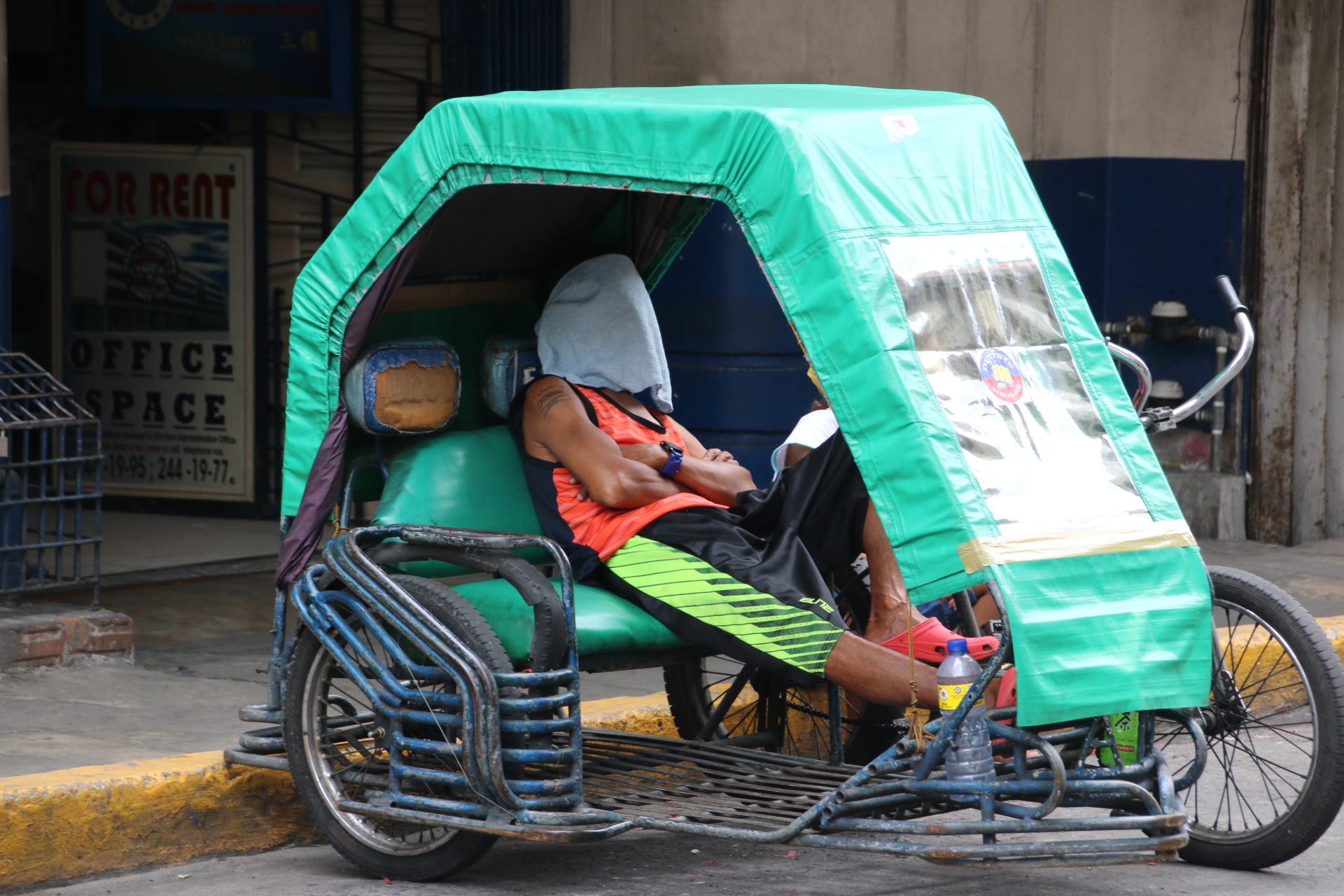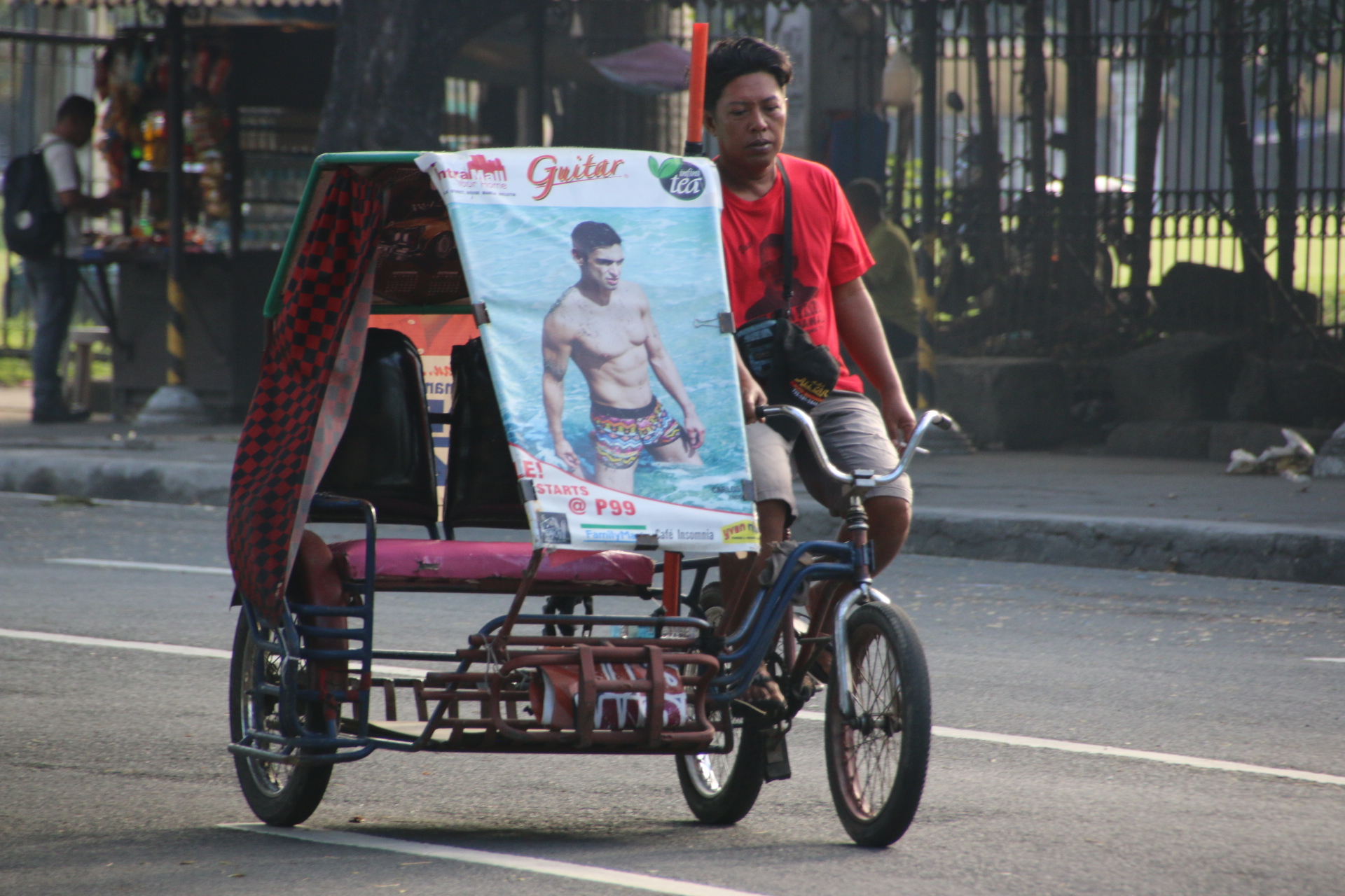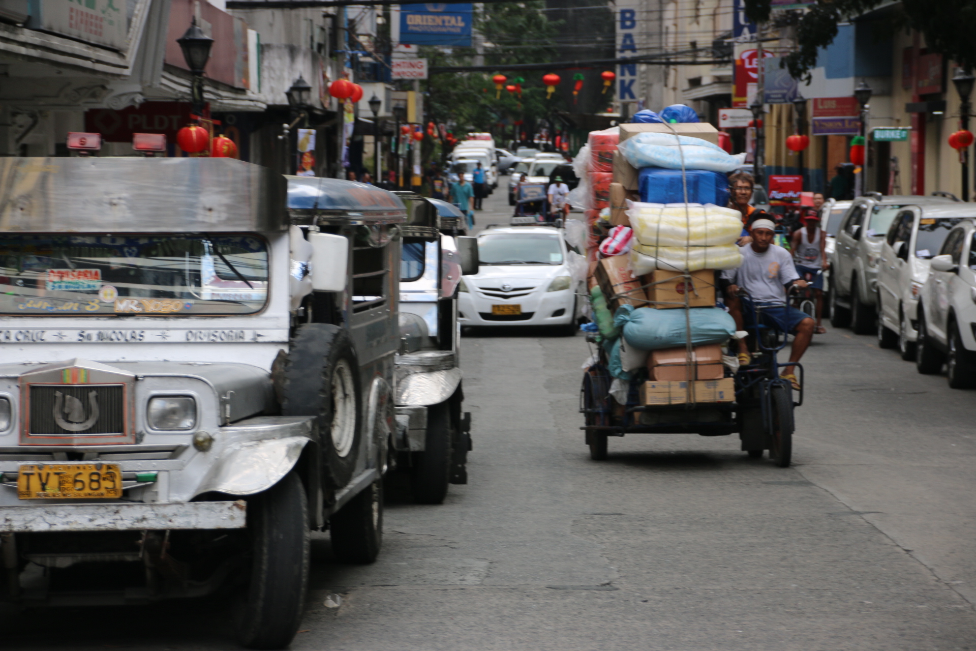 Ok into downtown Chinatown. Public transport is completely different to other Asian cities. First are the jeepnies. These are a. cross between a bus and a taxi. and are brightly coloured converted jeeps that the Americans left at the end of the war that have been extended to seat up to 14 passengers. They bang along their designated routes belching out smoke and gently sounding horns. Passengers flag them down, pay their 7 pesos (10p) and bang on the roof when they want to get off. Then comes the modern Toyota taxi with its air con-the Prince of the road. At the bottom of the heap are hundreds of mostly pedal powered tricycles where every journey costs 3 pesos..