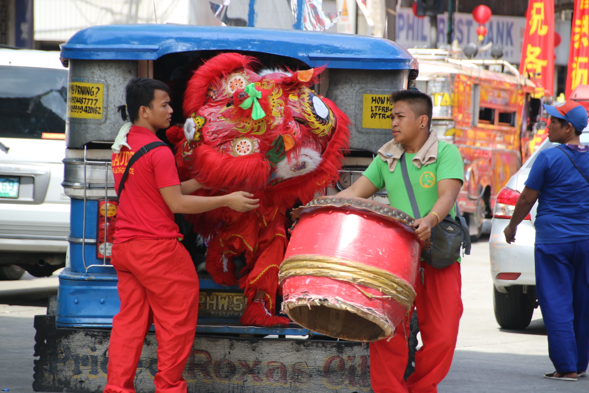 So down into the chaos of Chinatown. The noise of cymbals and drums and canned music compete with cries of sellers and screaming kids and music boxes and street bands. Snaking dragons and fluorescentmoths rear up at clusters of brightly coloured Mickey Mouse balloons or knock on the door of banks or shops.The most inventive are the street kids banging out a funky rhythm with two bits of wood on an olive oil can or a large water container while their mates do the moves holding a plastic veg tray on their head covered with a dirty sheet. Brilliant. There is definitely a place for the Horns and if a band of Manila’s ladyboys can get a samba groove together there is certainly a place for Larkrise.