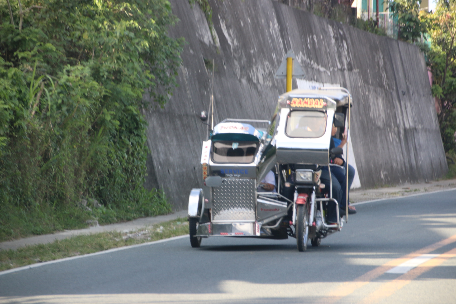 Travelling by bus I am squeezed out onto the skyway heading for the provinces and the open spaces to the south of Manila. Outside the capital the jeepny is no longer king. Here the motorised tricycle tuktuk has taken over as the main form of public transport. These are the shiny silver cockpits of space modules attached to the side of a motorbike and will take two passengers in a rather intimate space plus one on the pillion.