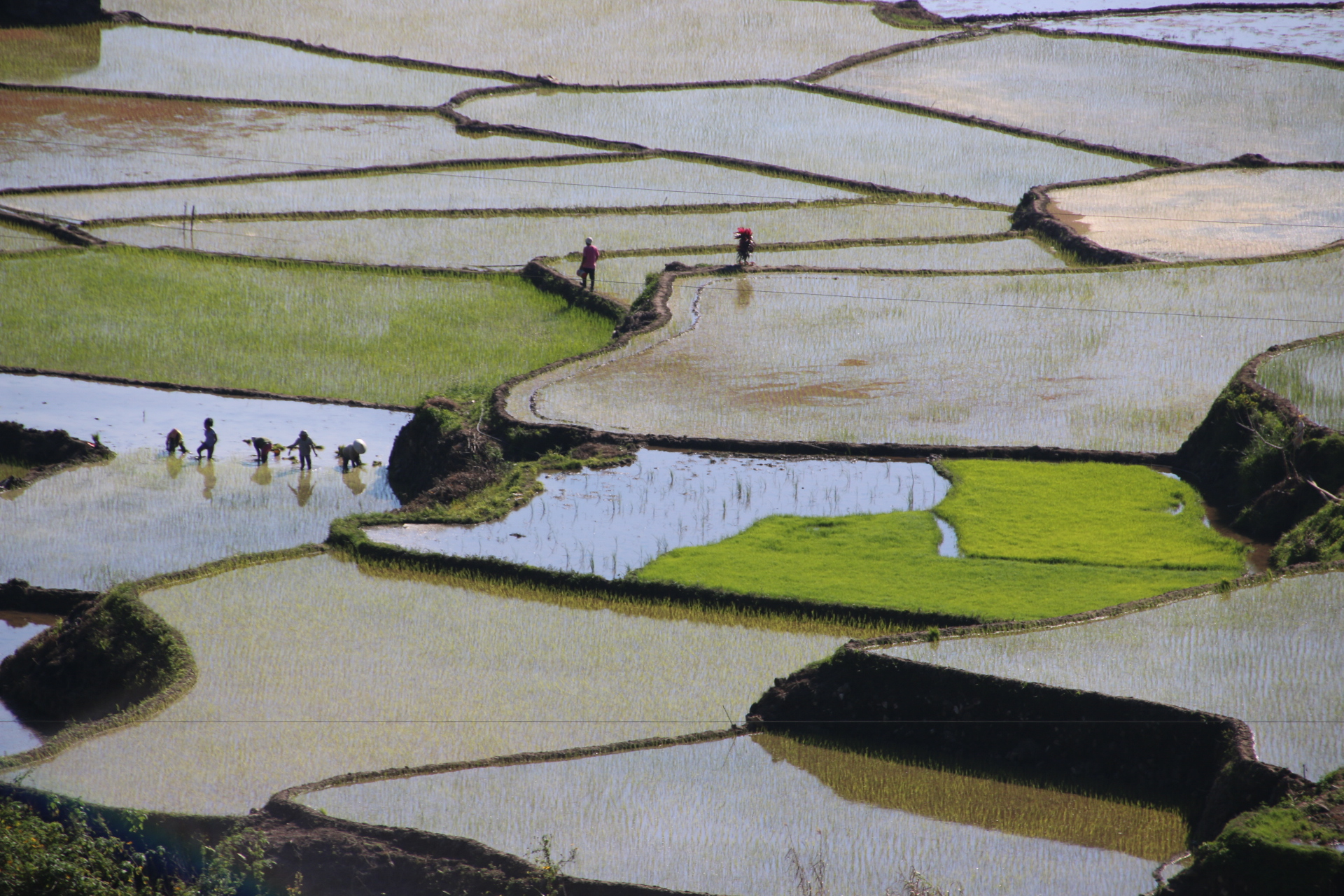 Along the road and along the rivers every space possible is terraced up to enable the locals to carry out their family farming. Valley sides and valley bottoms host the flattening effects of terraces where rice, in particular, and vegetables are grown in contour hugging collections of shape and size and colour and texture.