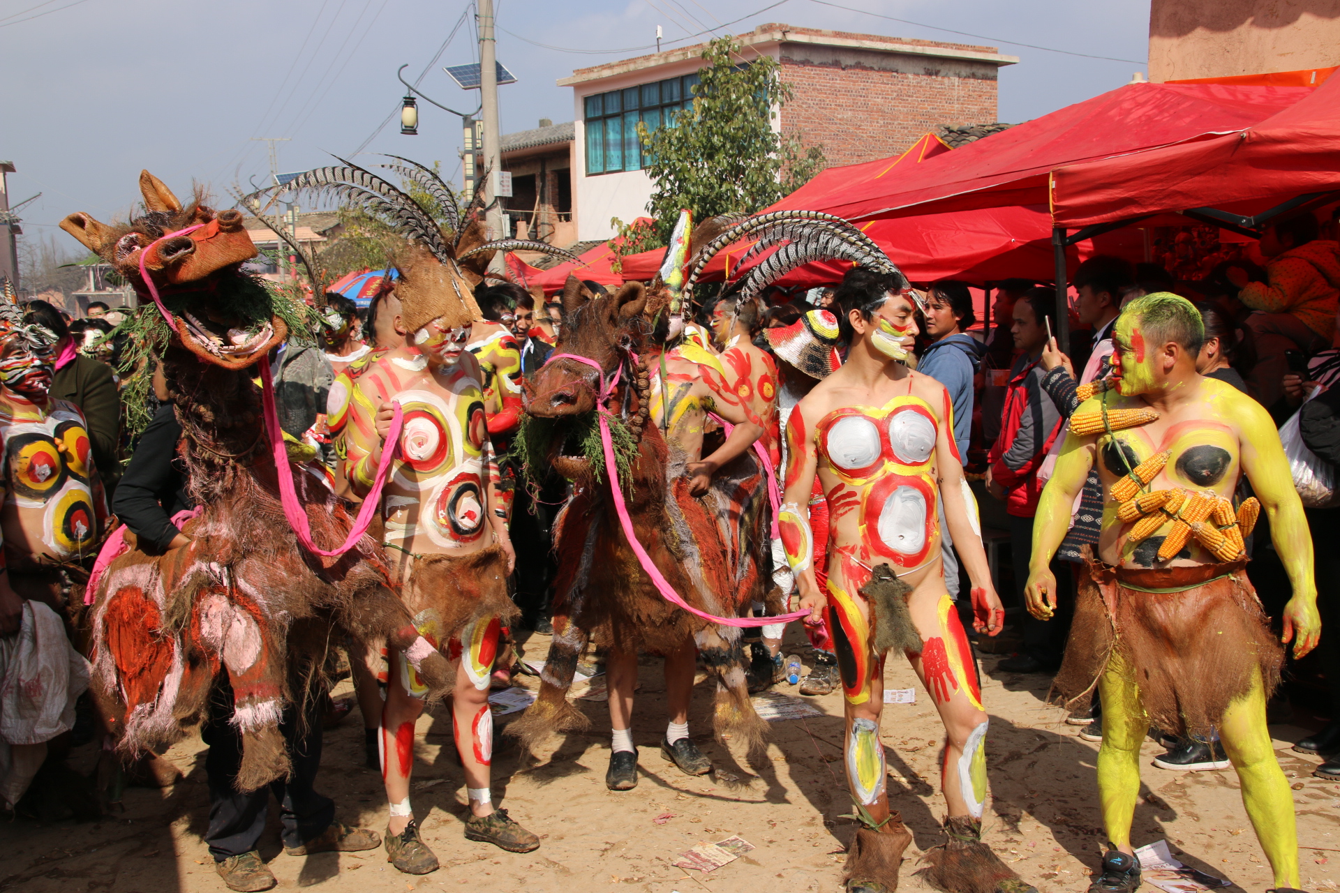 After the welcoming ceremony the crowds squeeze their way up the narrow main street to have the communal lunch and then gather around the village square. Boy, do these Chinese have some kit – huge lenses, I phones, selfie sticks all focused on the, now hammered, painted lads who do a circuit, light a fire, sacrifice a chicken ( yes, truly) and proceed to the main hillside where the thousands gather to watch the dancing and enjoy all the fun of the fair