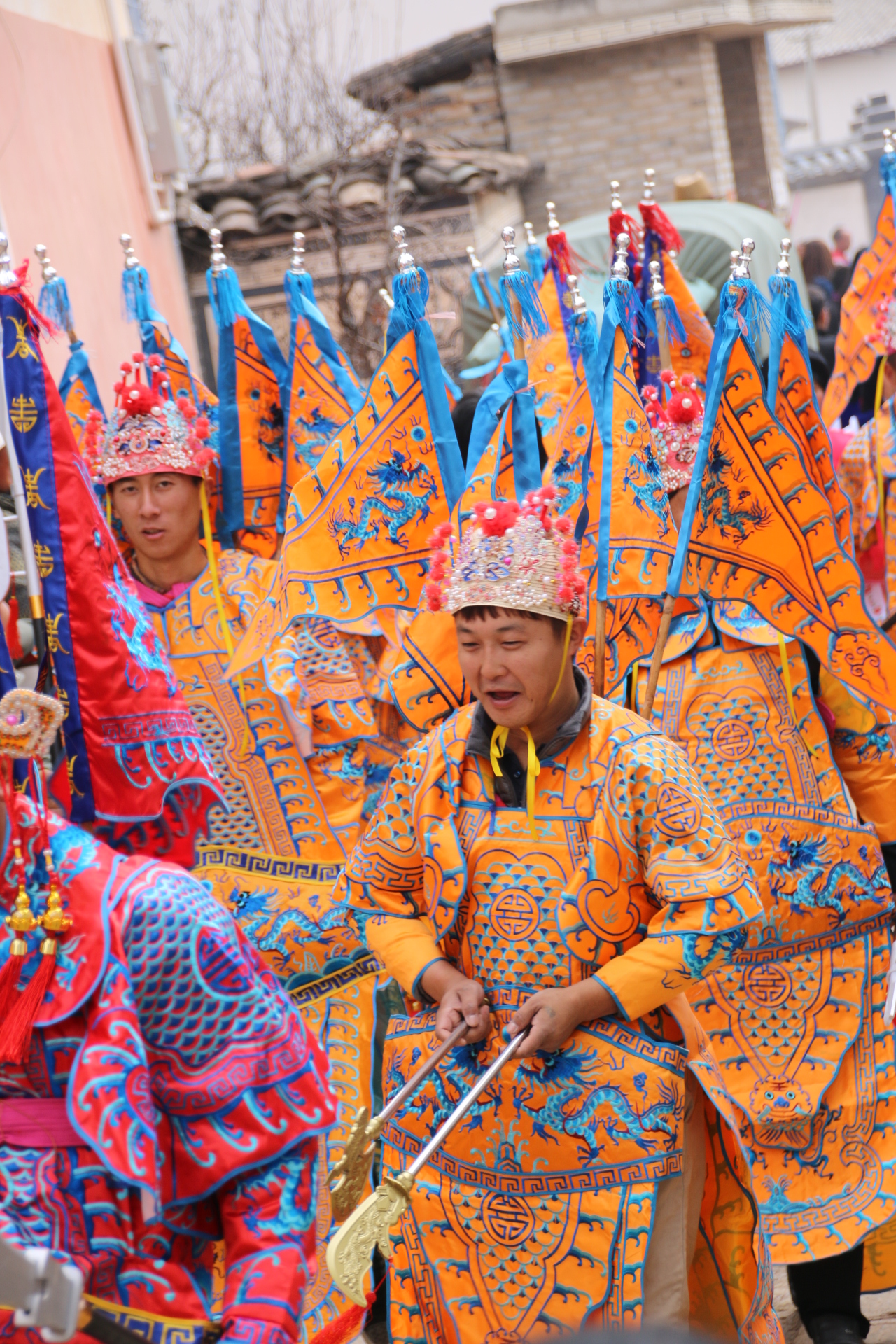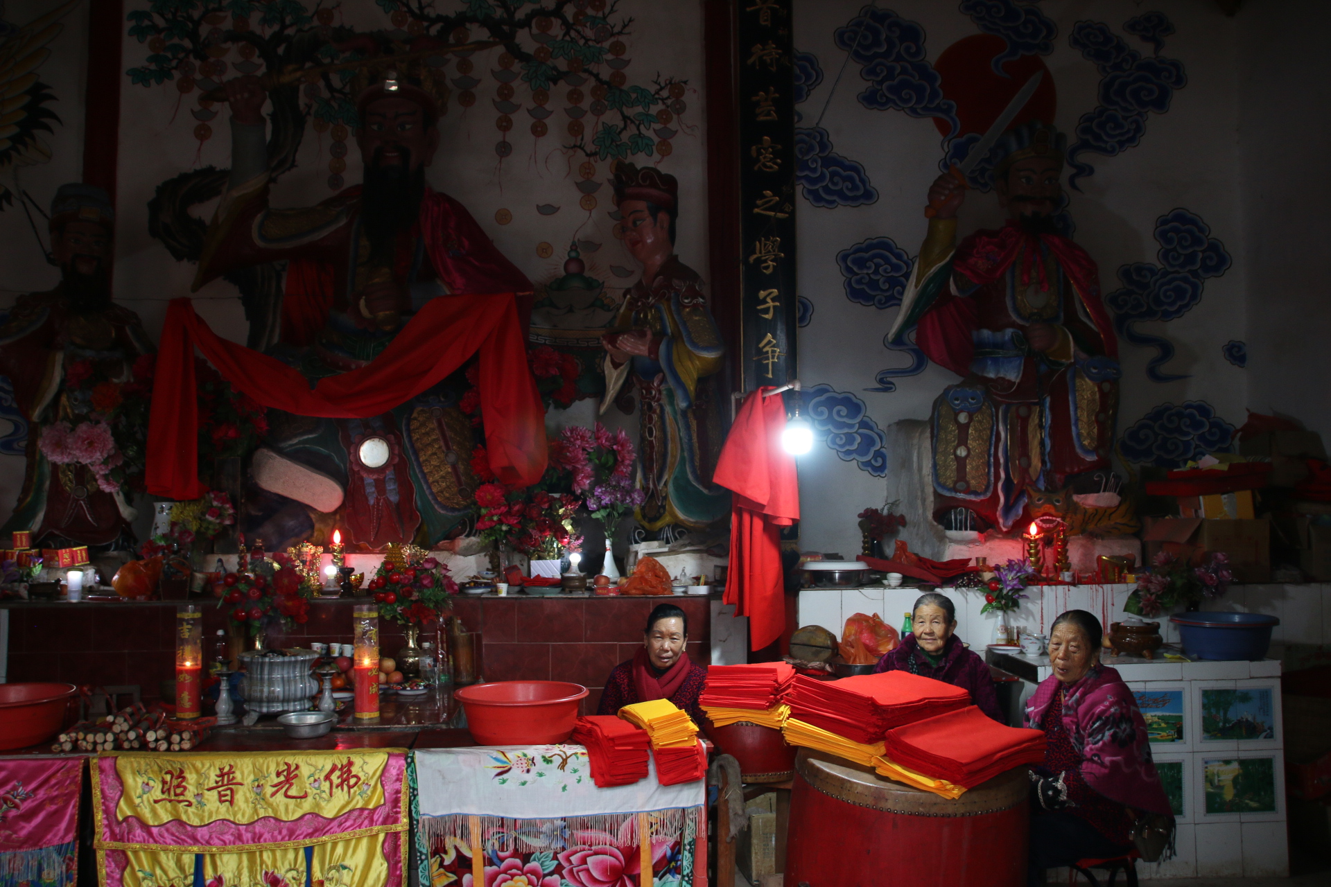 The performers start to assemble in the courtyard of the small temple outside the walls. A meal is prepared for them and the older members of the community. Groups sit around smoking and chatting, adjusting costumes, cracking jokes and reliving past parades. The percussion band of bells and cymbals and tams celebrate within the temple and then come outside to kneel as they play and chant. Incense sticks and smouldering pine branches and cigarettes lick across the courtyard in swathes of blue smoke, combining with the smell of steaming soup and noodles to create a swirling current of smells and sounds.