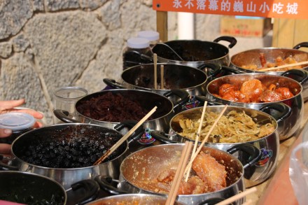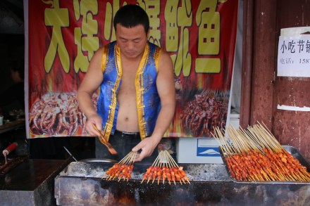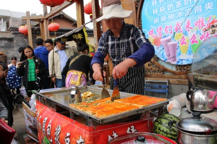 The other event is a food festival in Weishan’s old town. Once through North Gate it kicks off good and proper. The shops open out onto the street and stalls line the two main dragss that stretch from the four gates at each point of the compass. The smell and smoke from cooking fires, grilling and boiling anything from pigs to locusts to chicken feet, cover the streets with a sweet smelling haze which sets the hunger pangs off on a rollercoaster. Pancakes and sweets and dried fruits tantalize the taste buds. Enjoy the images and imagine the crowds  and the bustle and the smells.