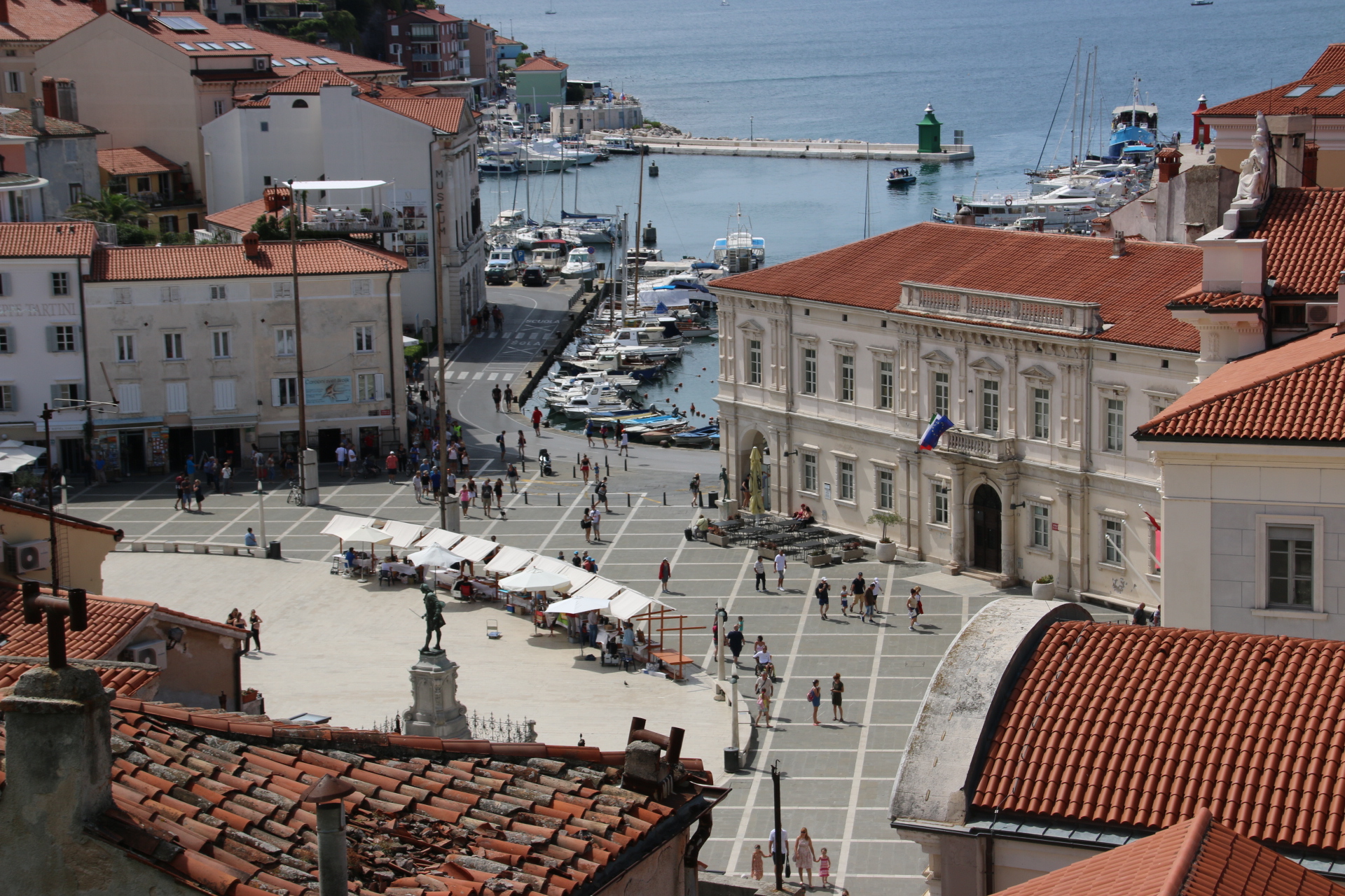 The main act of Piran has to be the pastel-toned, marble-paved Tartinijev Trg which used to be the inner harbour until it was filled in in 1894. The square is oval-shaped really and in the north corner stands the statue of the smartly dressed gentleman whose father was a famous local violinist and composer.