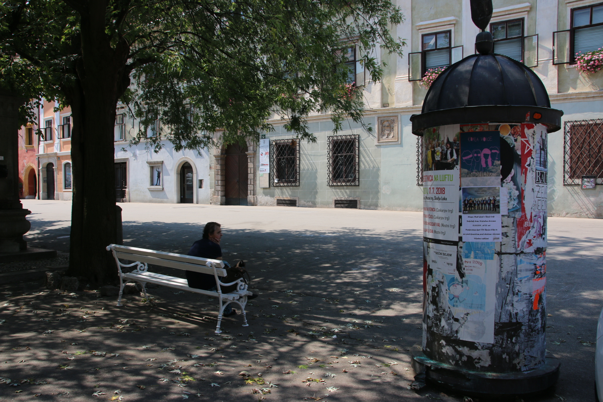 Mestni Trg is a long square with pastel-hued, 16th century burgers’ houses lining each side. The umbrellared cafes are busy. A few trees provide shade from the midday heat which slams down onto the cobbles and flag stones and sends folk into the shadows or indoors. Few people venture out and brave the bright sunshine.