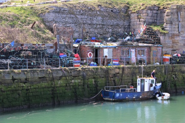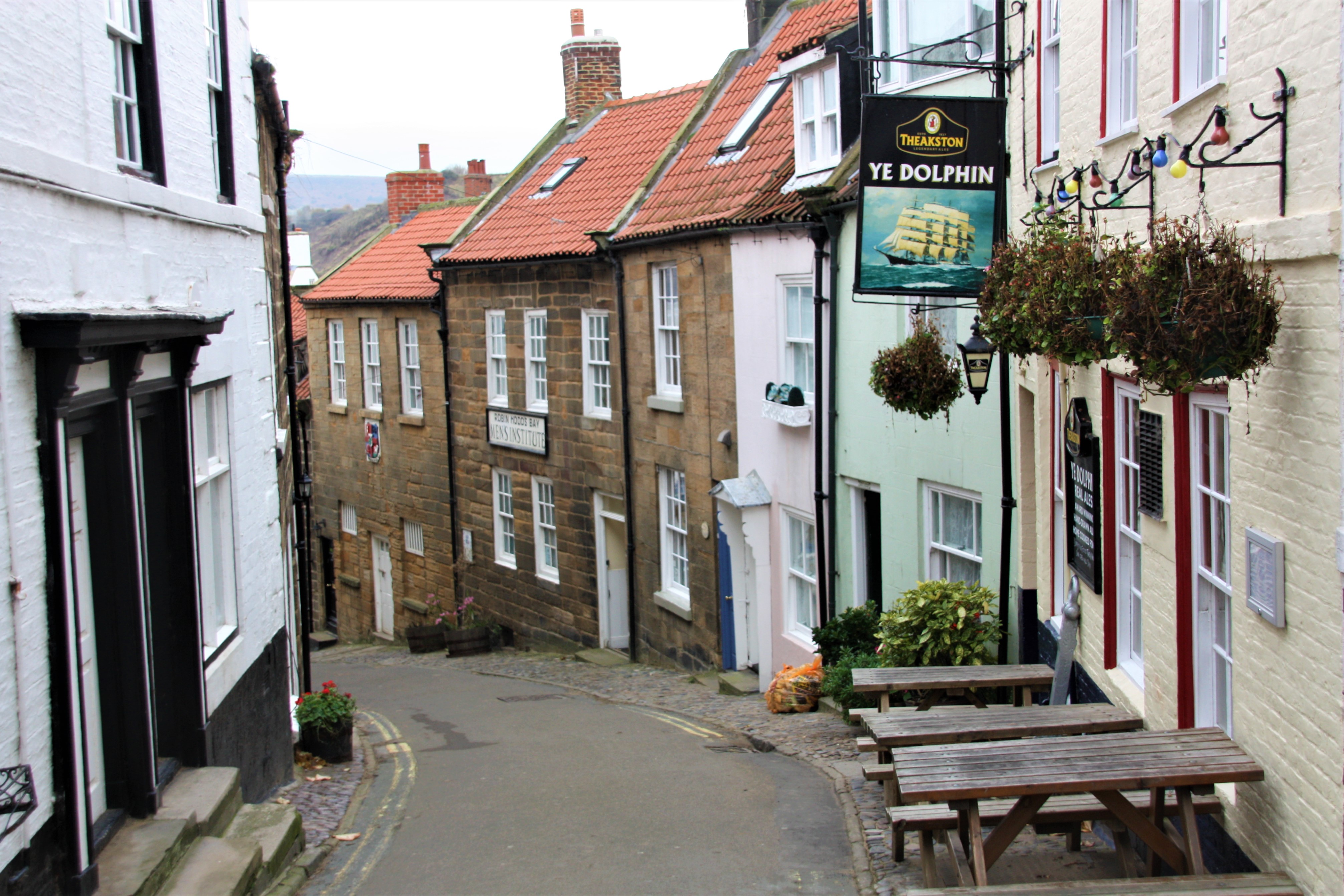 Now I do like Robin Hood’s Bay, a picturesque old fishing village with a family-friendly sandy beach. The car has to be parked at the top of the valley and further progress has to be made on foot. Wandering through its narrow, twisting cobbled streets and alleyways, are the ghosts of sailors and fishermen, smugglers and press gangs that walked here hundreds of years ago. Today it is a vibrant village, with a wide range of cafes, pubs, restaurants, small shops and places to explore. Deliveries to the pub have to be made on sack trolleys. Stone cottages with red roofs hug the steep slopes overlooking the bay. It feels like the village is built for hobbits with small gates, small gardens, small doors & small windows. Progress down the stone steps alongside the main route down fills the visitor with slight apprehension in the knowledge that this same journey has to be made in reverse. The cobbled slipway leads out onto the beach where, at low tide, families in wellies prod about in the pools that form in the rocks. The sea defences stand hugely powerful above the sandy beach, protecting the village from all the elements can throw at it.