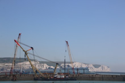 Today, cross-Channel ferries, liners and cargo ships come and go relentlessly from its giant harbour. The old Cruise Terminal, an enclosed walkway used for boarding and disembarking cruise ships provides excellent views of all the activities of the harbour and access to the pier itself. The famous white cliffs can be seen in the distance in both directions. On the quays of the Outer Harbour huge ferries wait, with mouths gaping wide, to swallow their cargoes of cars and lorries, ready to regurgitate them on the other side. The south side is more small scale with a line of ramshackle huts standing haphazardly at the top of the pebbly beach. There is little activity. A few individuals work on small craft.