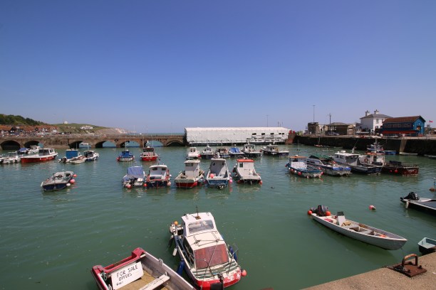 The Leas, a superb clifftop promenade with wide lawns and colourful flowerbeds stretch for a mile or so. On the landward side are tall stucco Victorian houses and large hotels. On the seaward side steep cliffs overlook the Old High Street which slopes down to the harbour where small boats bob about in the water at high tide and languish in the mud when it is out. The arched viaduct over the harbour provides memories of yesteryear when trains used to arrive from London for the boat-train. The carriages were loaded onto ferries for the journey across to France. This service stopped in 1980.