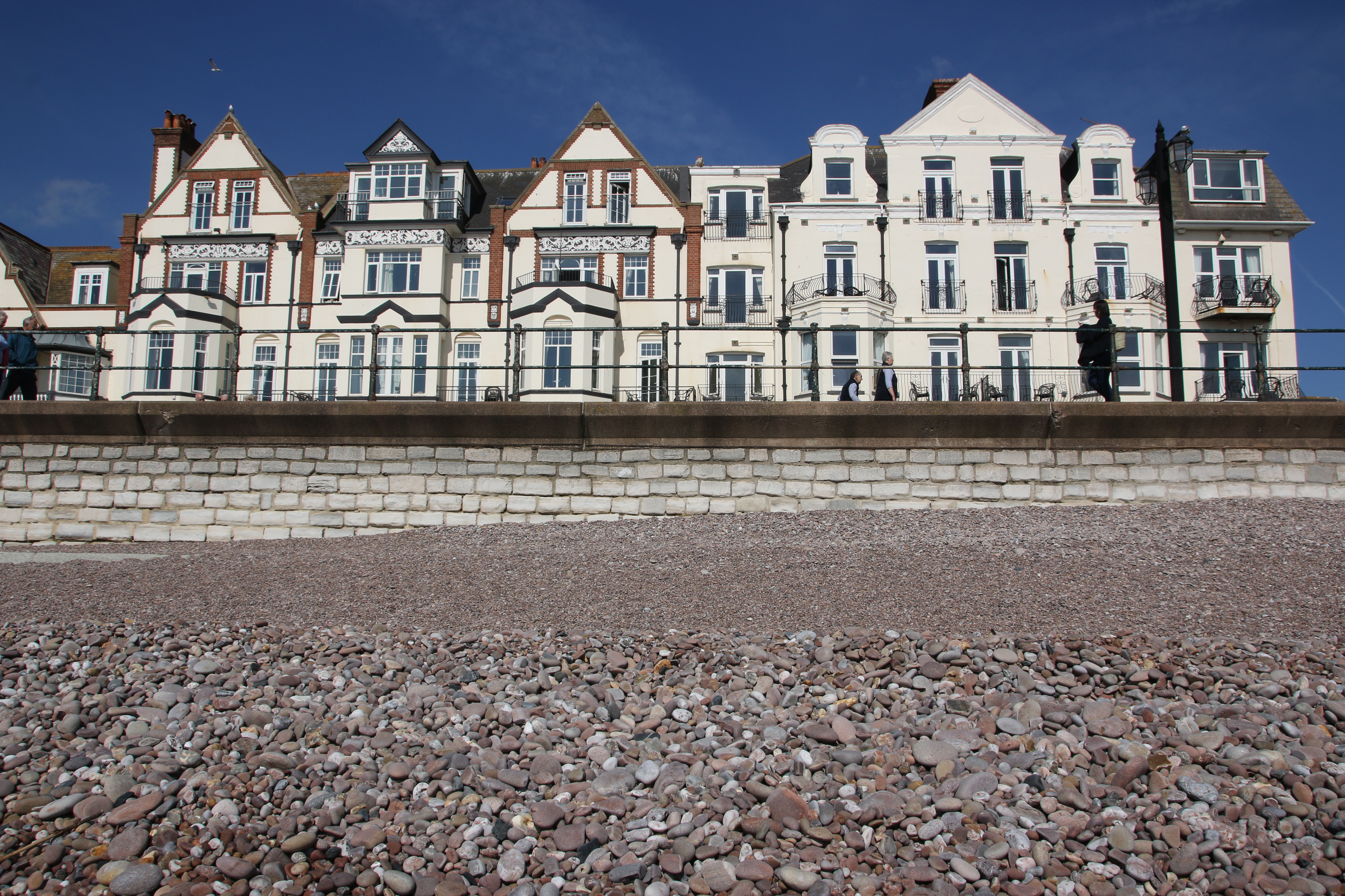 This small town is sited where the River Otter reaches the sea. Its broad sweep of pink, pebbled beach is guarded by red sandstone cliffs.