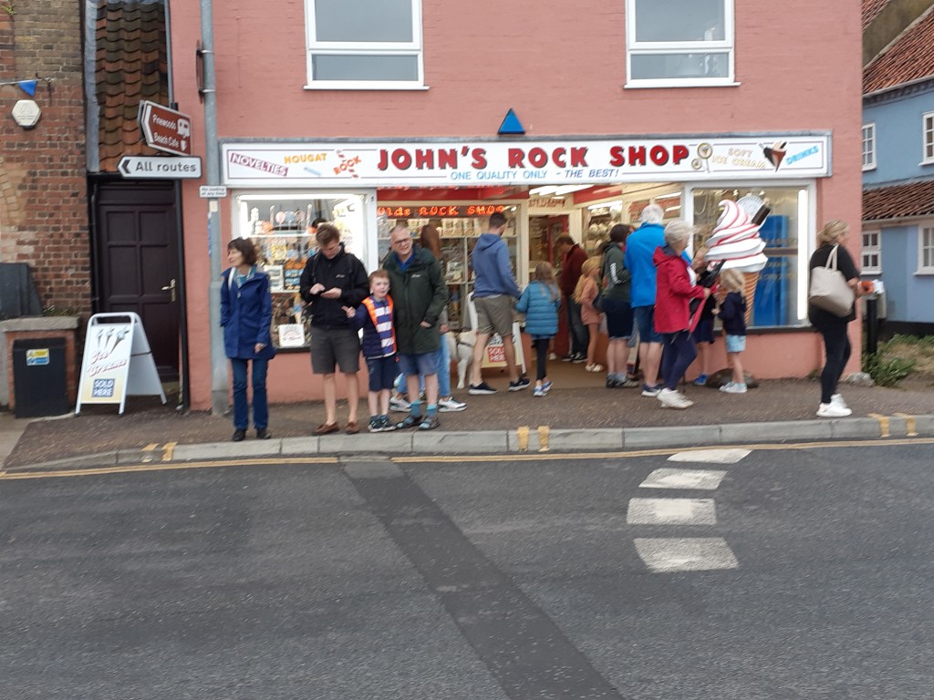 There seems to be a distinct lack of cafes. The condensationed windows of the occasional shop unit give a clue, confirmed by the queue waiting to enter. On the streets, punters balance trays of fish & chips or erupting cones of ice cream, sourced from doorways or windows.