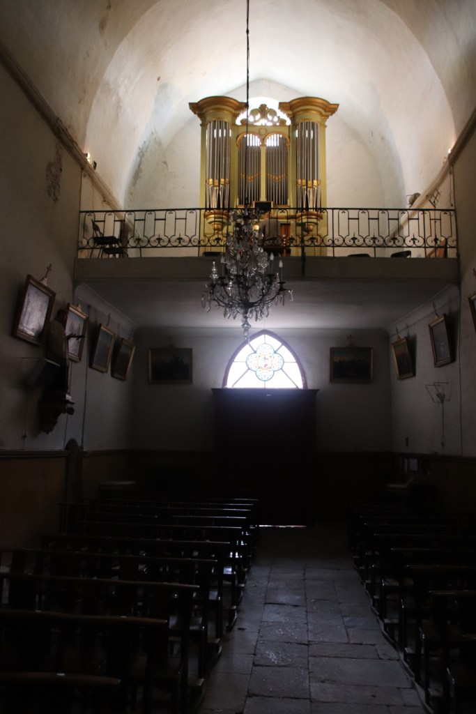 Peeking inside the historic church, an old lady follows us in and points out in local, incomprehensible French a side chapel containing a font made from the same marble as used in Versailles by French kings (I think!). She turns out to be the organist – having left through the front door, she appears up on the organ loft & proceeds to give a private rendition of some wonderfully poignant piece that echoes around this empty space, leaving emotions exposed and senses shredded.
