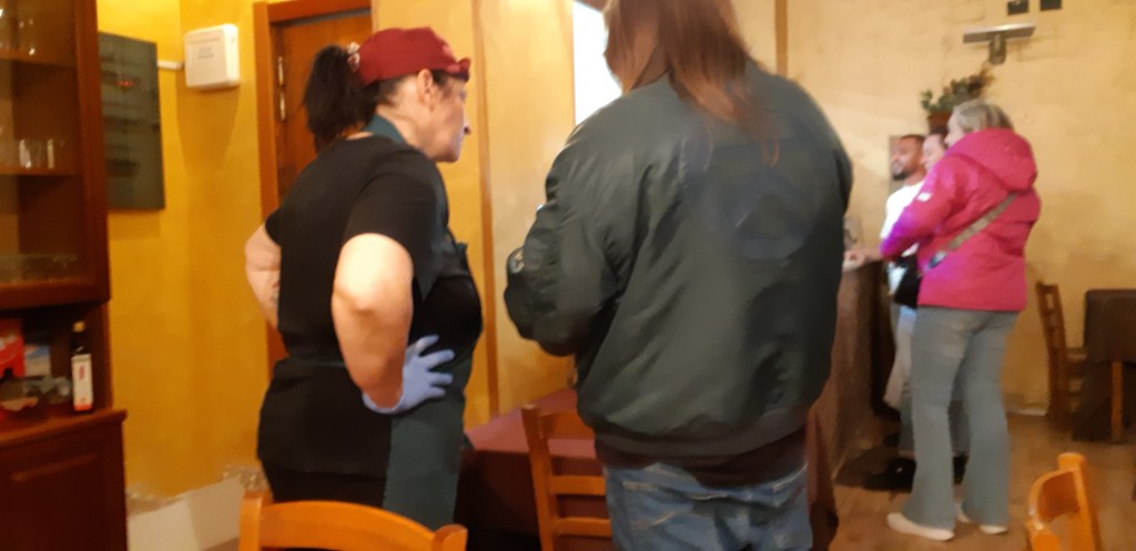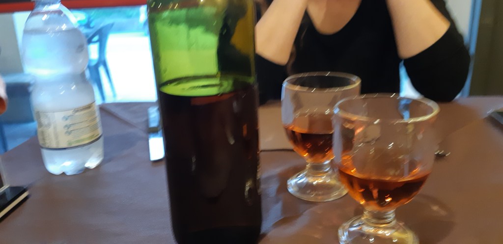 It’s all up hill from that point. Using the QCR code we make our choices. A large, smiling man appears from the back & we start a friendly banter with no Italian & little English. ‘DrinK? Red wine or red wine?’. ‘Oh, rosso’. I think he saw us naive Brits coming – ‘large or v large?’ We gesture the size of a bottle & he points to bottom shelf of the fridge, a single bottle looking forlorn, ‘local wine; red & white wine’) We agreed. At 10 euros a pop it seems a bargain…. & it is local! The unlabelled bottle arrives at the table. The first suspicion that this is not a vintage bottle comes as he pours – the colour is that of petrol & the initial taste is reminiscent of diluted cough medication. That really never leaves as we empty the bottle as quickly as possible, showering false compliments as we go. Still, its alcohol & it breaks the ice.