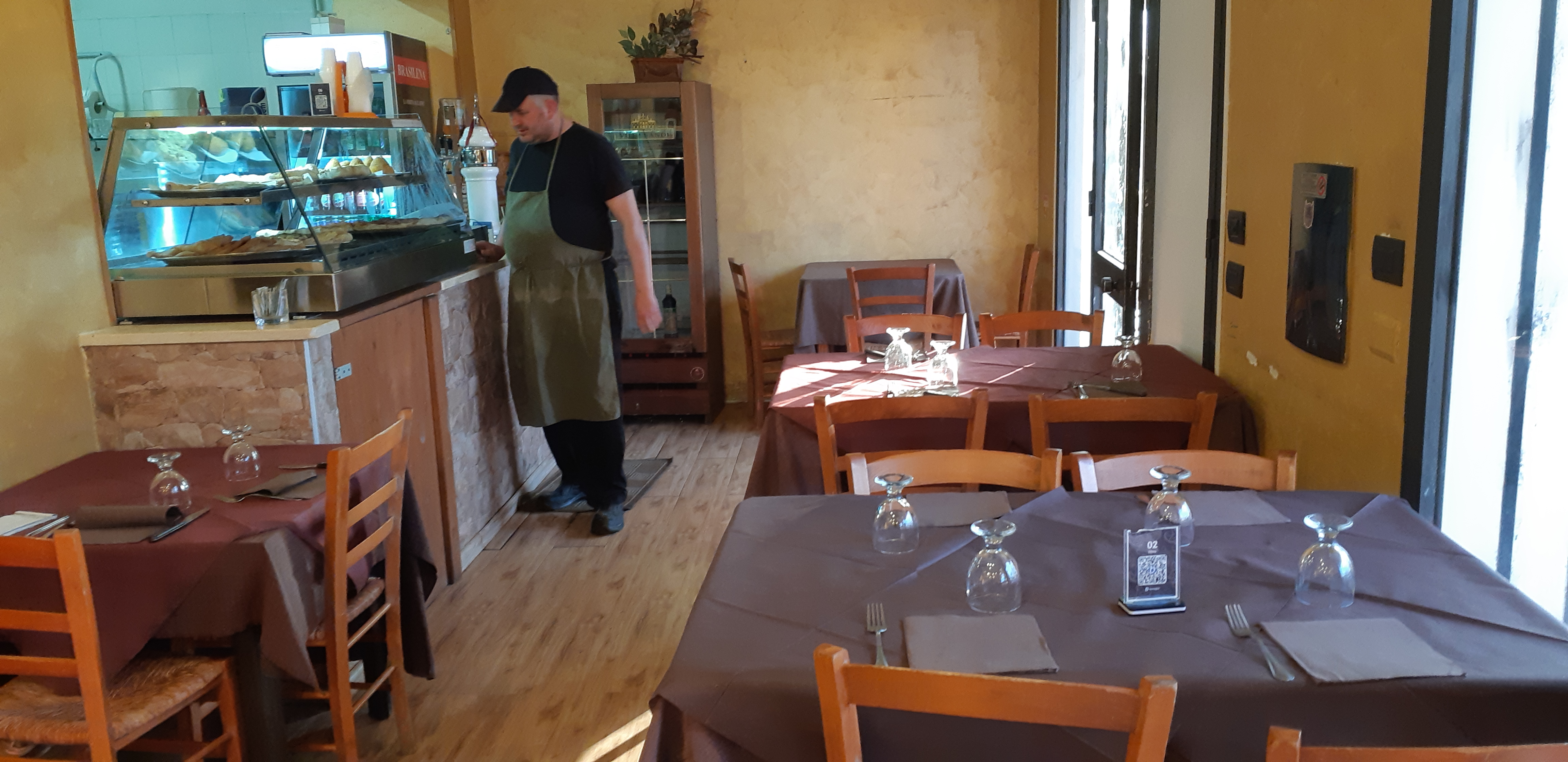 It’s all up hill from that point. Using the QCR code we make our choices. A large, smiling man appears from the back & we start a friendly banter with no Italian & little English. ‘DrinK? Red wine or red wine?’. ‘Oh, rosso’. I think he saw us naive Brits coming – ‘large or v large?’ We gesture the size of a bottle & he points to bottom shelf of the fridge, a single bottle looking forlorn, ‘local wine; red & white wine’) We agreed. At 10 euros a pop it seems a bargain…. & it is local! The unlabelled bottle arrives at the table. The first suspicion that this is not a vintage bottle comes as he pours – the colour is that of petrol & the initial taste is reminiscent of diluted cough medication. That really never leaves as we empty the bottle as quickly as possible, showering false compliments as we go. Still, its alcohol & it breaks the ice.