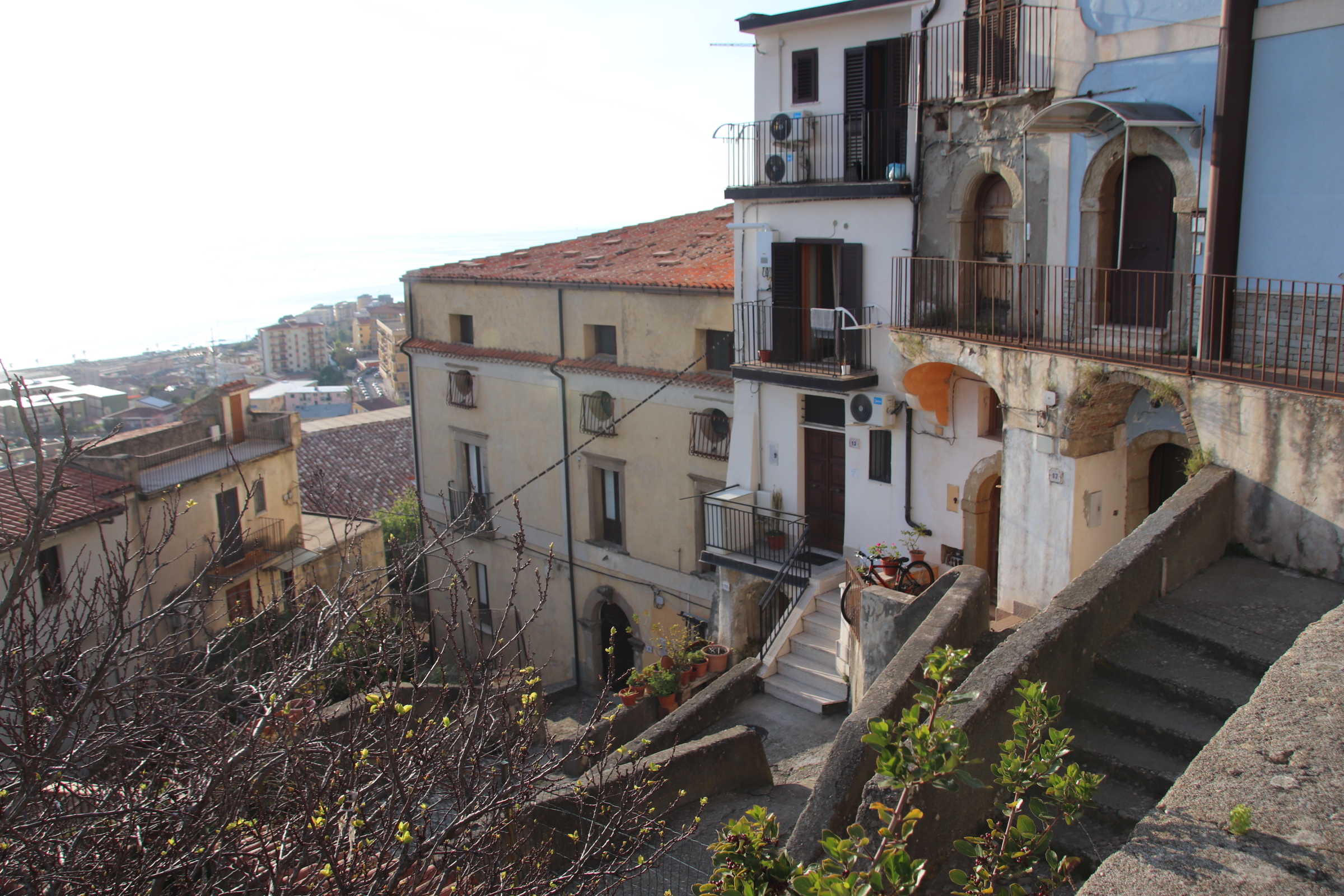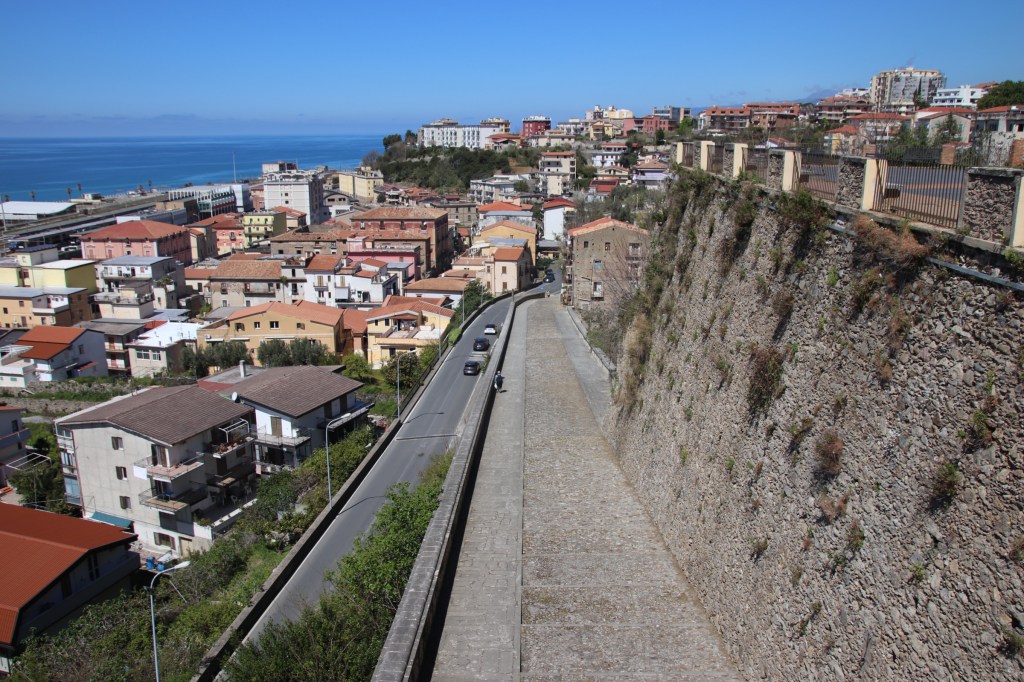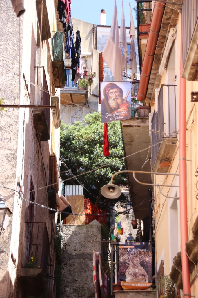 After the wonders of the mountains of Calabrian, it is back to the coast for a few days in Paola. Let me say at the start that Paola is utterly fascinating. It has grown up on the narrow strip of shore between the sea & the mountains. Beside the shore the modern part spreads in both directions with all the trappings of modern life – apartment blocks, schools, railway tracks & station. It doesn’t really count for much; just an ordinary, functional, modernish kind of town.