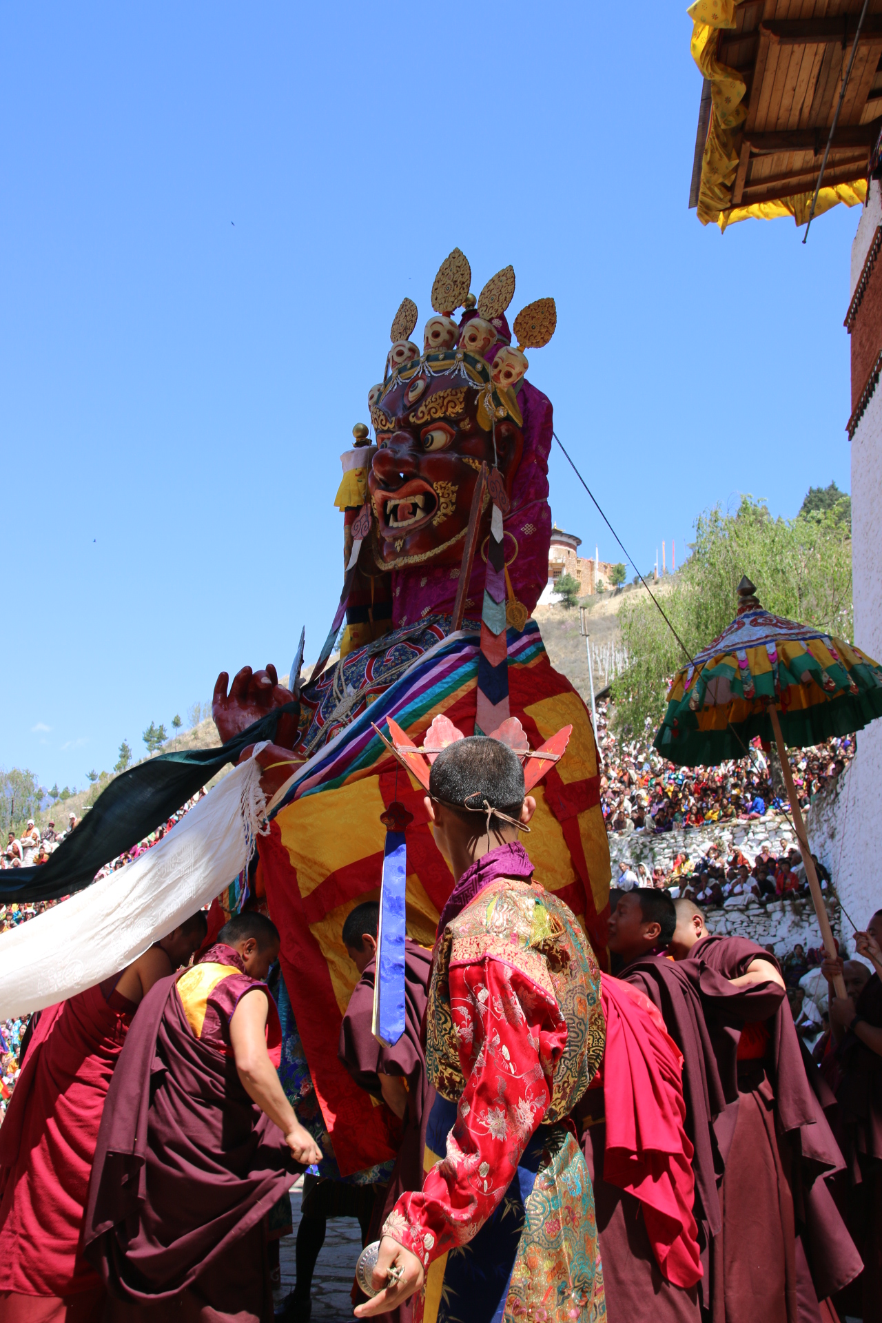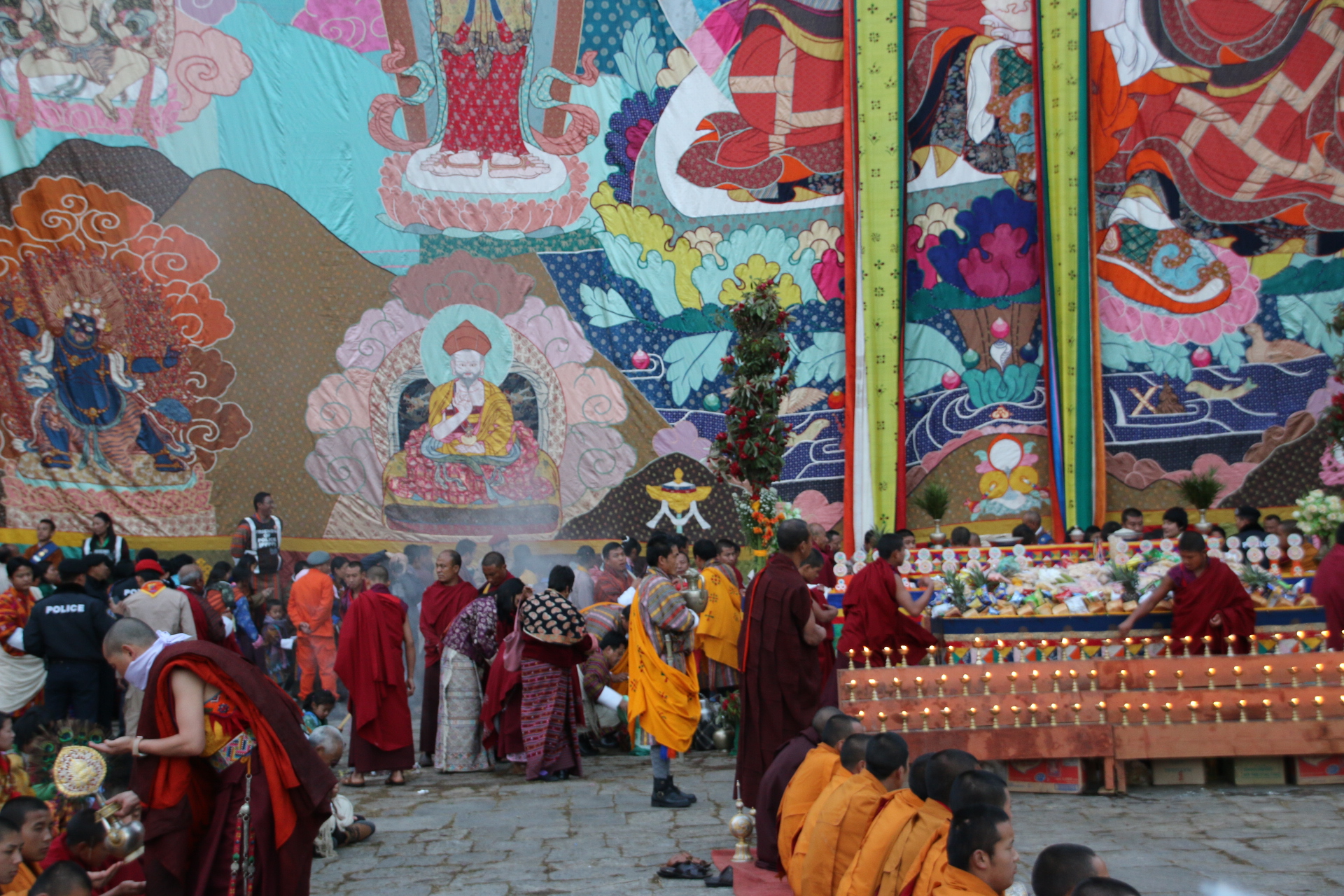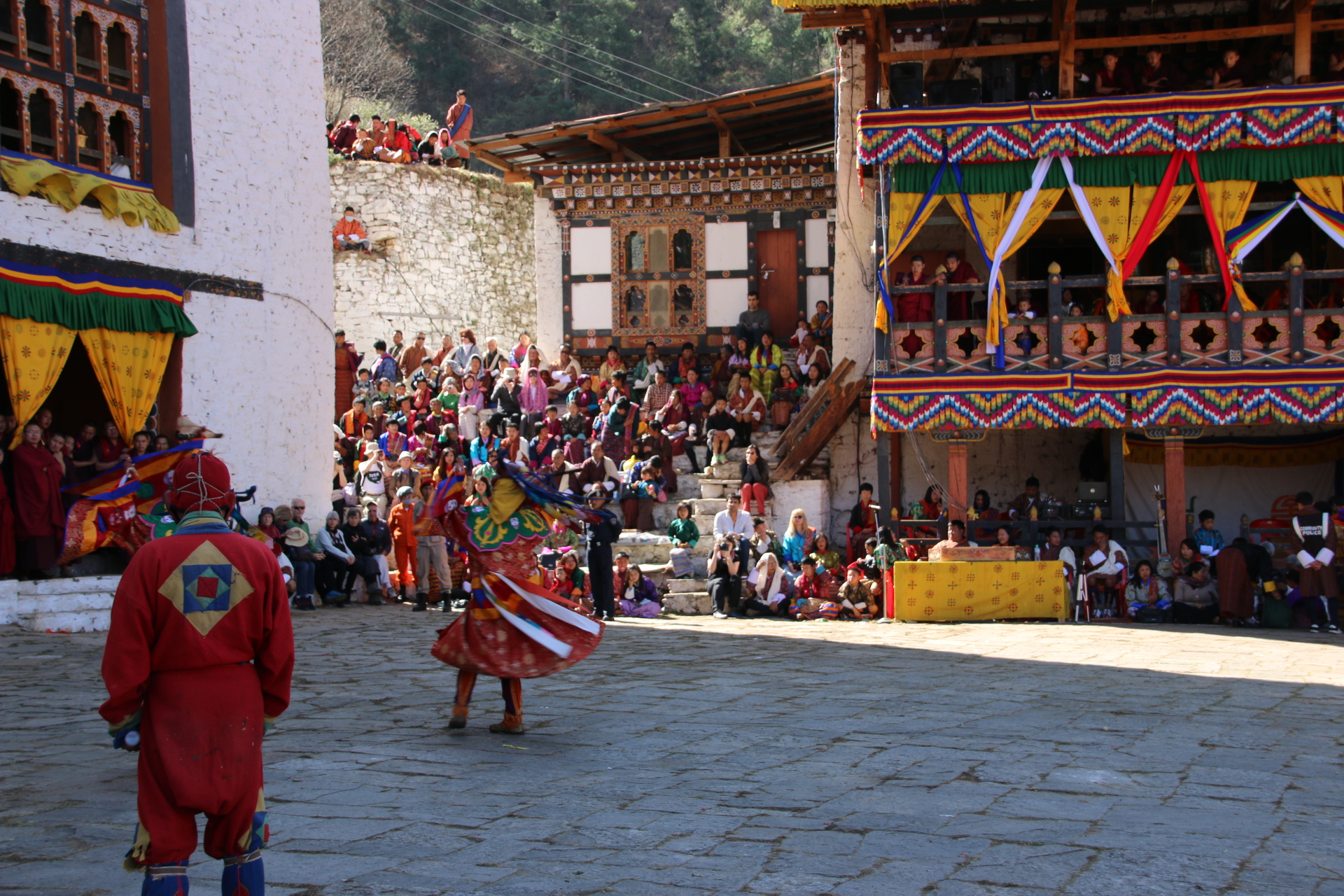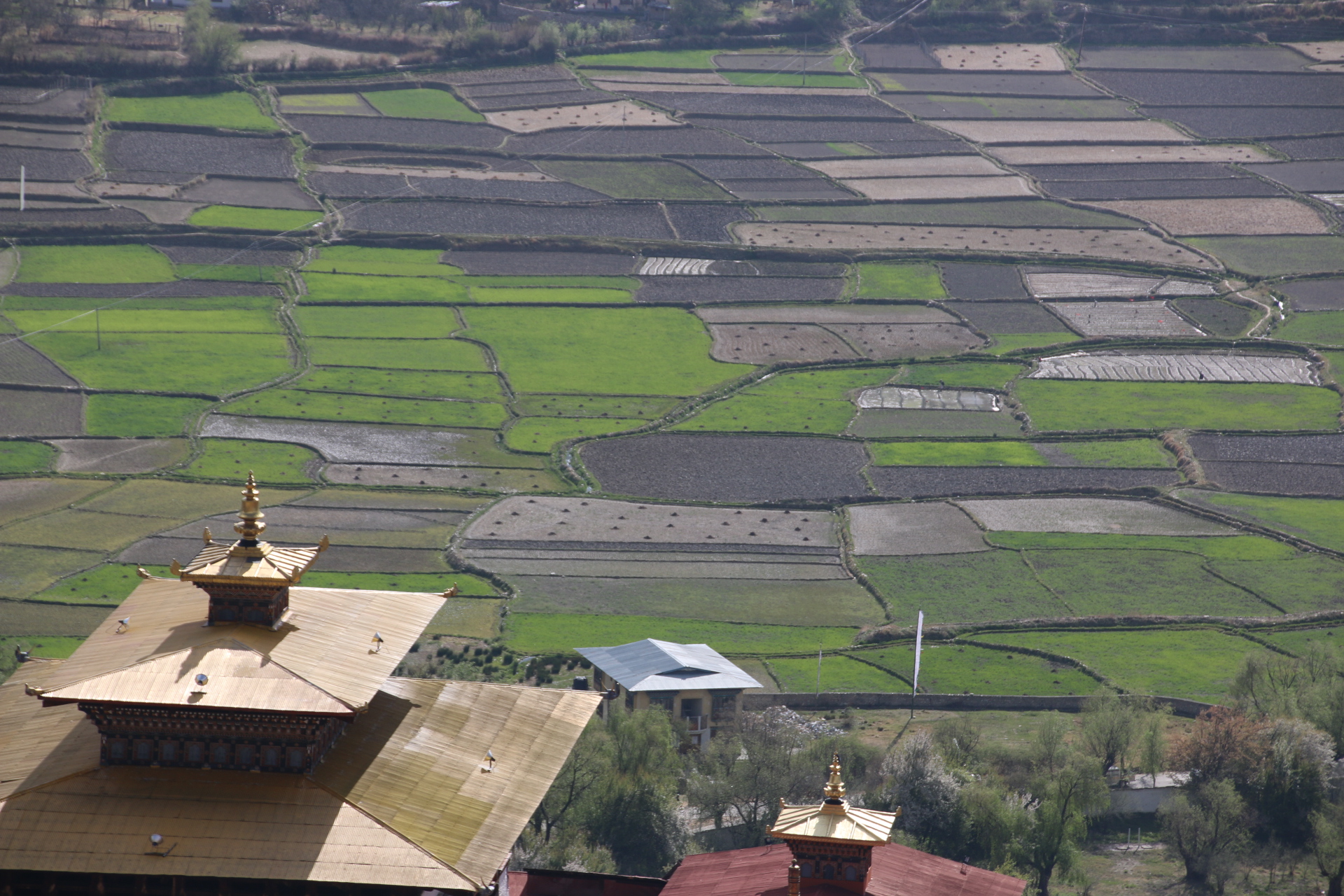 So today I leave Thimpu and drive up through the Doucha La Pass at 3,200 metres (yes, over 9,000 feet). Gets very wheezy moving about at that altitude! At that height the pines give way to tall, tall, TALL junipers. The bus crashes up & down the marble run of the Himalaya. Lunch is taken in a small village & fast service restaurant which overlooks paddy & wheat terraces. At this point I have to give an explanation about why i have not posted some very graphic images.Every house from here to Pharo have large phalli painted on their walls. I emphasise this is to protect the home from evil spirits & demons. Some are exceptionally graphic!!!!
